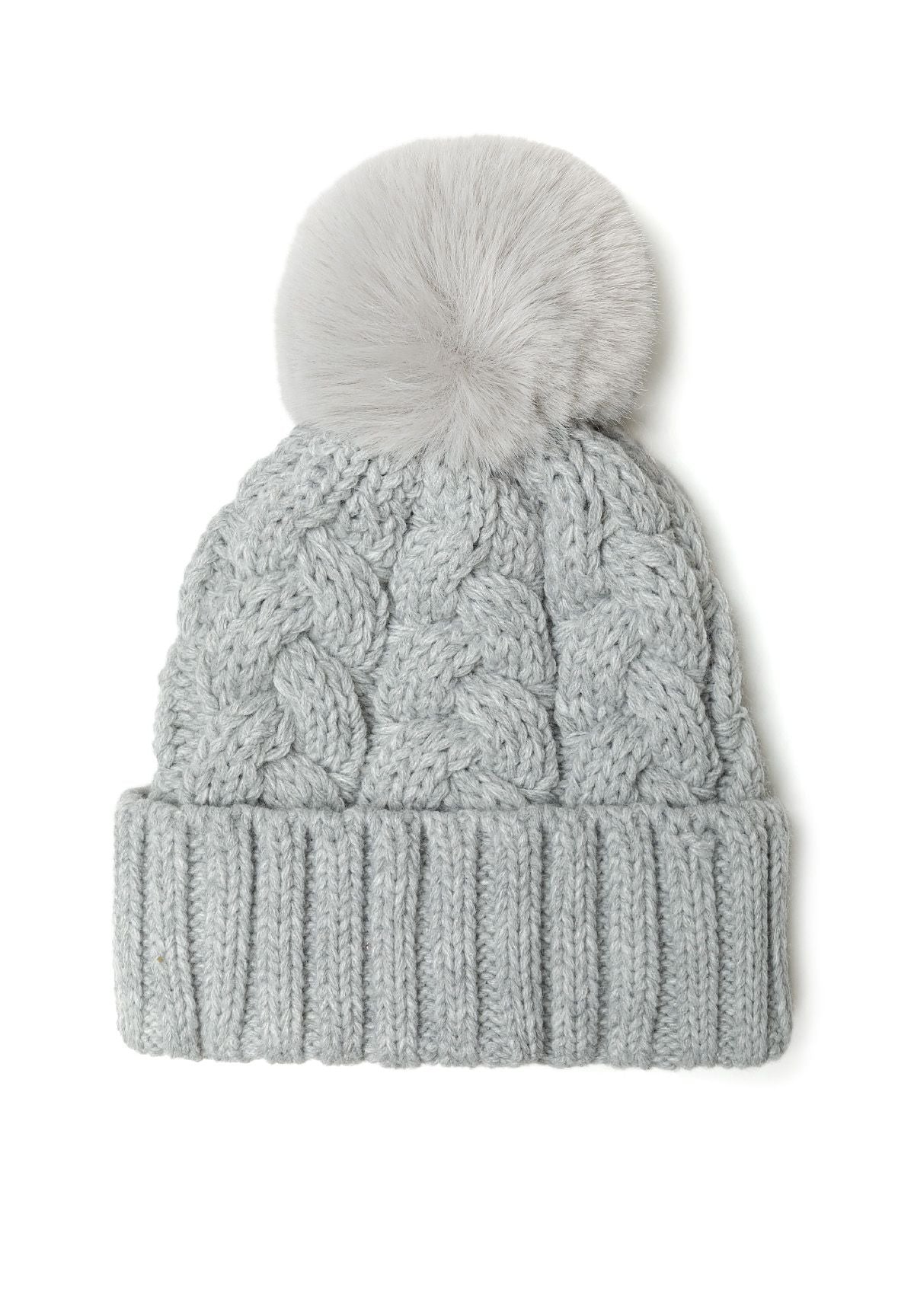 Knitted cable pom pom hat crafted for girls, designed to provide warmth and practical coverage during cold weather. the hat displays a grey colour paired with a classic cable knit pattern that extends across the entire surface, topped with a distinctive pom pom. it ensures a soft and comfortable fit suitable for everyday wear in colder seasons, shaped to fit without causing pressure or discomfort. the knitting offers both insulation and breathability, balancing warmth with air flow. the elasticated nature allows the hat to adapt to various head shapes securely. featuring a ribbed edge for fit retention, simple and functional hat is tailored for outdoor use, combining essential cold protection with subtle style elements.