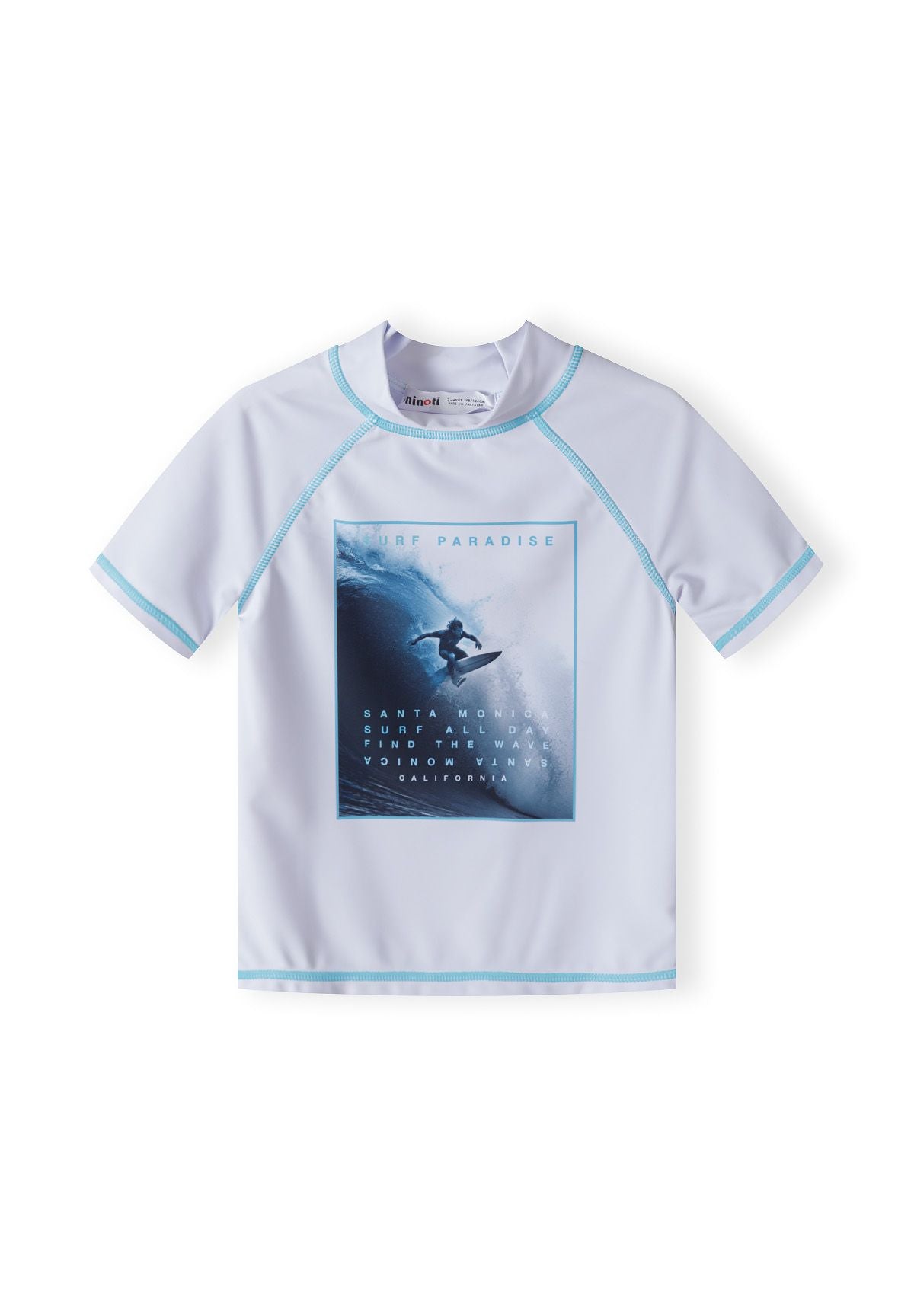 Chłopięca koszulka z krótkim rękawem zaprojektowana, aby zapewnić ochronę przed słońcem podczas wodnych zabaw na świeżym powietrzu, wykonana z tkaniny z filtrem UV. Biała baza ozdobiona jest dekoracyjnym wzorem związanym ze sportami wodnymi, który podkreśla atrakcyjny wygląd, zachowując jednocześnie funkcjonalność. Raglanowe szwy biegną od dekoltu do pachy, co zwiększa elastyczność i swobodę ruchów, idealne do aktywnej zabawy. Niski stójkowy kołnierz zapewnia skromne osłonięcie szyi, jednocześnie gwarantując przewiewność i wygodę. Lekka i szybko schnąca tkanina pomaga utrzymać komfort noszenia, gdy koszulka jest mokra, i szybko schnie po pływaniu lub zabawach w wodzie. Koszulka łączy skuteczną ochronę przeciwsłoneczną z praktycznymi cechami dostosowanymi do chłopięcych aktywności na świeżym powietrzu w ciepłe dni.