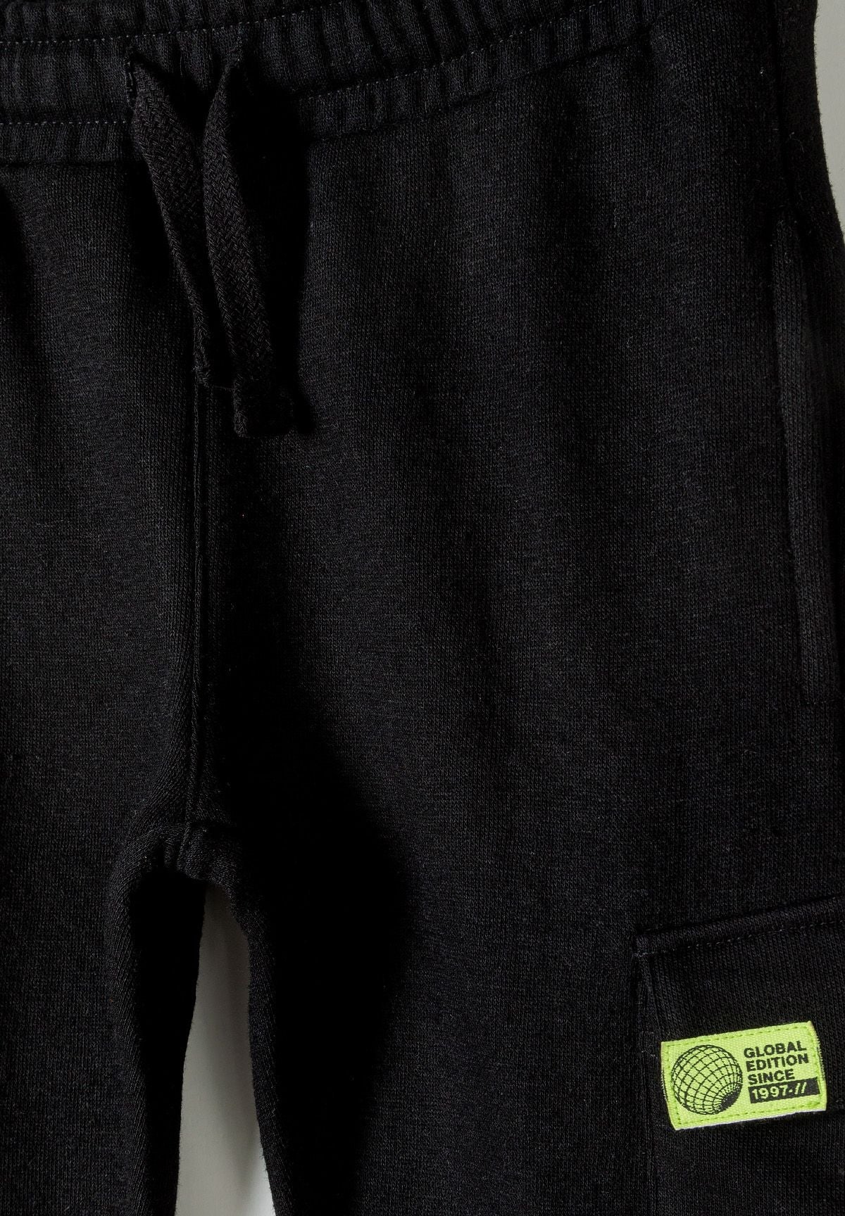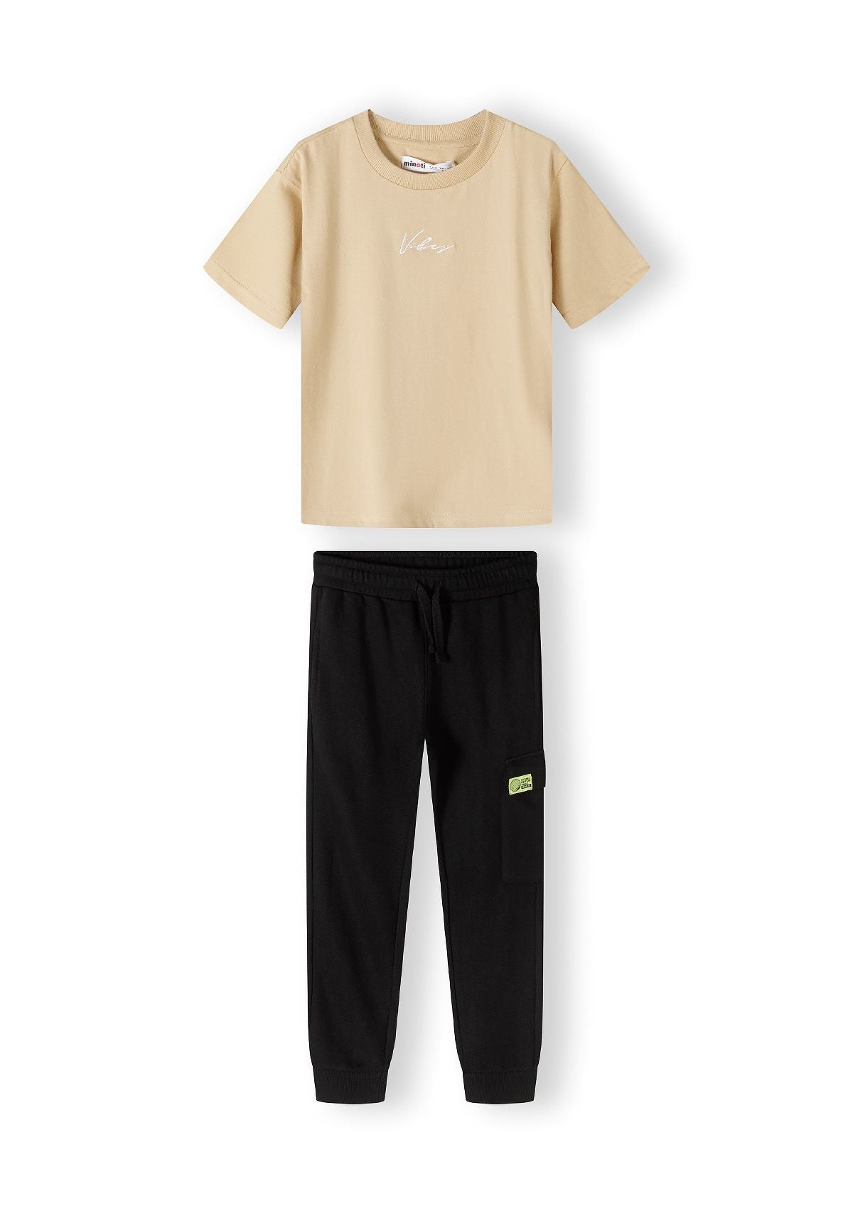Komplet składa się z krótkiego rękawa koszulki z dzianiny oraz polarowych spodni dresowych zaprojektowanych wyłącznie dla chłopców. Koszulka ma klasyczny okrągły dekolt oraz ozdobne hafty z przodu, prezentując czysty i minimalistyczny styl. Polarowe spodnie dresowe w kolorze czarnym posiadają elastyczny pas z regulowanym sznurkiem, zapewniając indywidualne i wygodne dopasowanie. Praktyczne boczne kieszenie umożliwiają wygodne przechowywanie, a ściągacze przy kostkach pomagają utrzymać spodnie na miejscu i zapobiegają podwijaniu się nogawek. Oba elementy mają luźny krój, który pozwala na swobodę ruchów. Wykonane z materiałów odpowiednich do codziennego, casualowego noszenia, komplet jest praktyczny na umiarkowane temperatury i zaprojektowany tak, aby wytrzymać regularne pranie i użytkowanie.