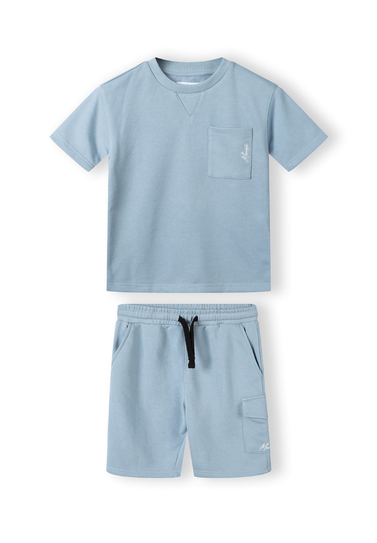 Zestaw ubrań dla chłopców obejmuje koszulkę z krótkim rękawem oraz dopasowane spodenki, zaprojektowane z myślą o codziennym, swobodnym użytkowaniu. Jasnoniebieska koszulka ma okrągły dekolt i krótkie rękawy, zapewniając pełną swobodę ruchów i wygodę noszenia. Posiada kieszonkę na piersi, idealną do przechowywania drobnych przedmiotów. Dopasowane spodenki mają ten sam jasnoniebieski kolor i elastyczny pas ze sznurkami, które pozwalają na regulację i pewne dopasowanie. Kieszeń typu cargo na spodenkach oferuje dodatkowe miejsce do przechowywania, nie zaburzając casualowego wyglądu. Oba elementy mają luźny krój, gwarantujący komfort i swobodę ruchów, idealne na łagodne temperatury w sezonie SS25.