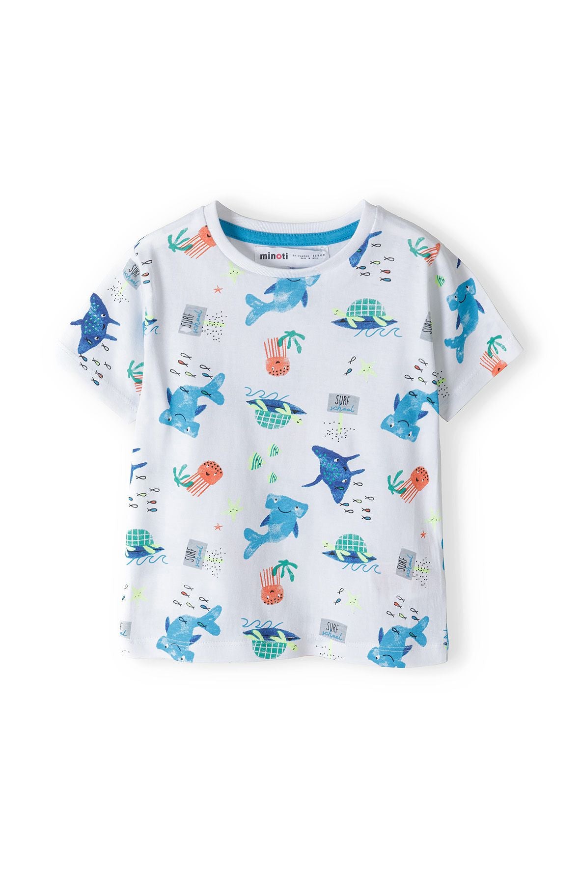 Letni strój dla chłopca składający się z krótkiego rękawa koszulki z nadrukiem na całej powierzchni oraz jasnżółtych spodenek z polaru. Koszulka wykonana jest z miękkiego, lekkiego materiału, który zapewnia przewiewność i wygodę w ciepłe dni. Polarowe spodenki mają elastyczny pas z troczkami do regulacji, co gwarantuje dopasowanie i wygodę noszenia. Zestaw ma luźny krój, który zapewnia swobodę ruchów, idealną do aktywności na świeżym powietrzu. Praktyczny design obejmuje łatwe w pielęgnacji materiały, które zachowują kształt i żywe kolory po praniu. Połączenie to prezentuje swobodny styl z funkcjonalnymi detalami, doskonały na codzienne noszenie w letnich miesiącach.