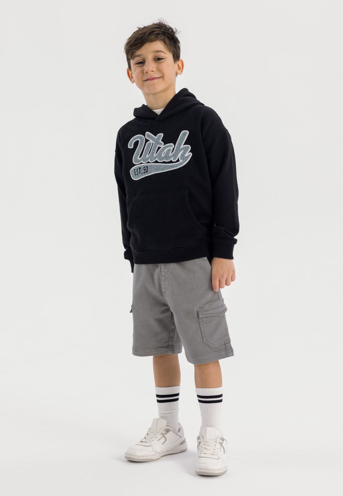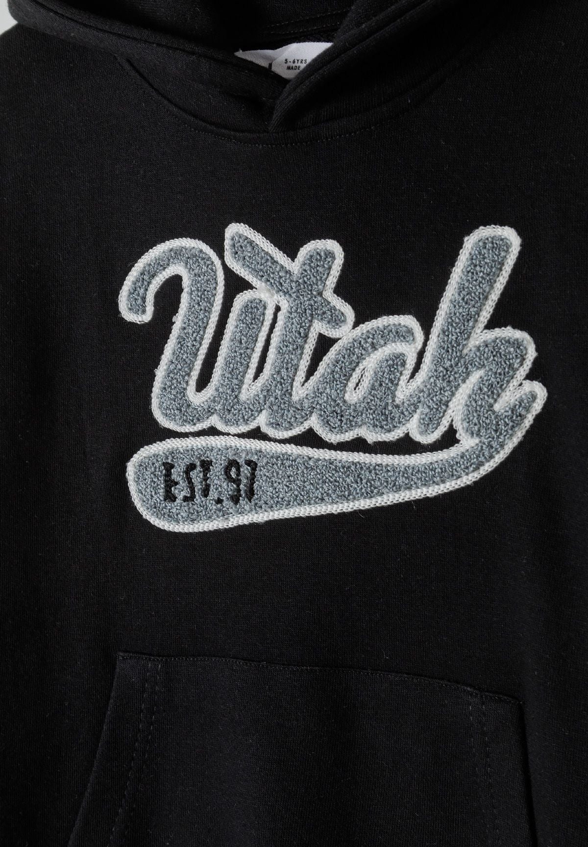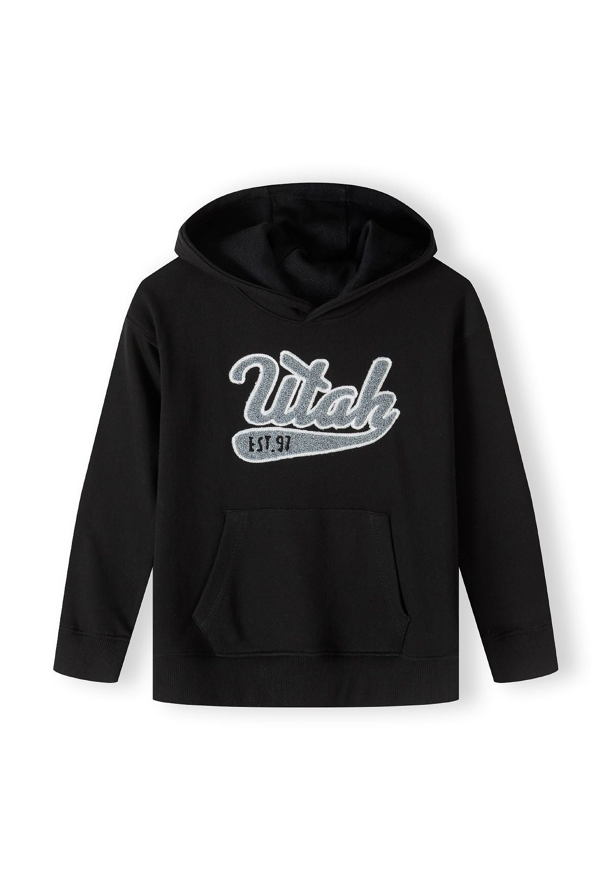 Wykonana z miękkiej bawełnianej dzianiny polarowej, ta czarna bluza chłopięca zapewnia wygodę i funkcjonalność podczas codziennego noszenia. Praktyczny kaptur oferuje dodatkową ochronę i komfort, a opuszczone szwy na ramionach zapewniają luźne dopasowanie, umożliwiając swobodę ruchów przez cały dzień. Długie rękawy z ściągaczami utrzymują bluzę na miejscu, jednocześnie zachowując elastyczność. Dekoracyjny nadruk na piersi dodaje stylu, a kieszeń kangurka służy jako wygodne miejsce do przechowywania lub ogrzewania rąk.