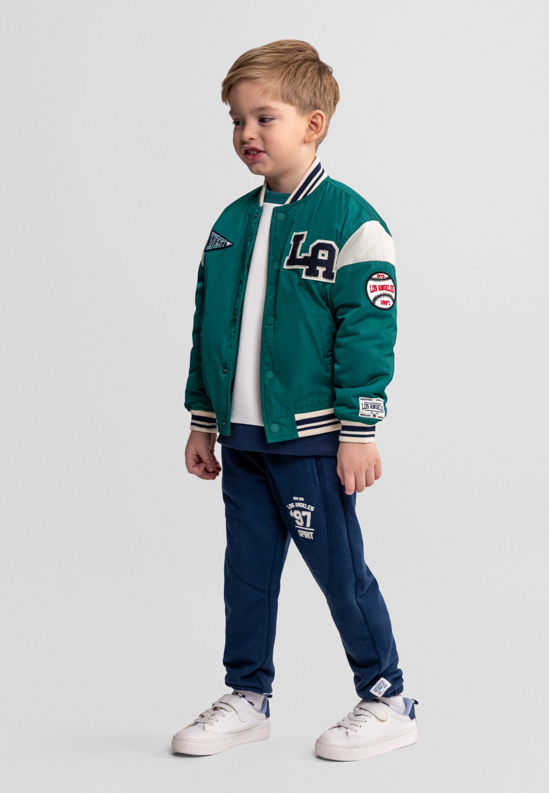 Sport spotyka się ze stylem w tej chłopięcej bomberce varsity — klasycznym, inspirowanym stylem college'owym projekcie stworzonym dla aktywnych dzieci w wieku od 9 miesięcy do 7 lat. Wykonana z tkanego poliestru z lekkim ociepleniem i pełną podszewką, jest wiatroszczelna, lekka i gotowa na wszystko — od drogi do szkoły po weekendowe przygody. Zatrzaski i haftowane detale na piersi nadają jej autentyczny varsity wygląd, który chłopcy uwielbiają.