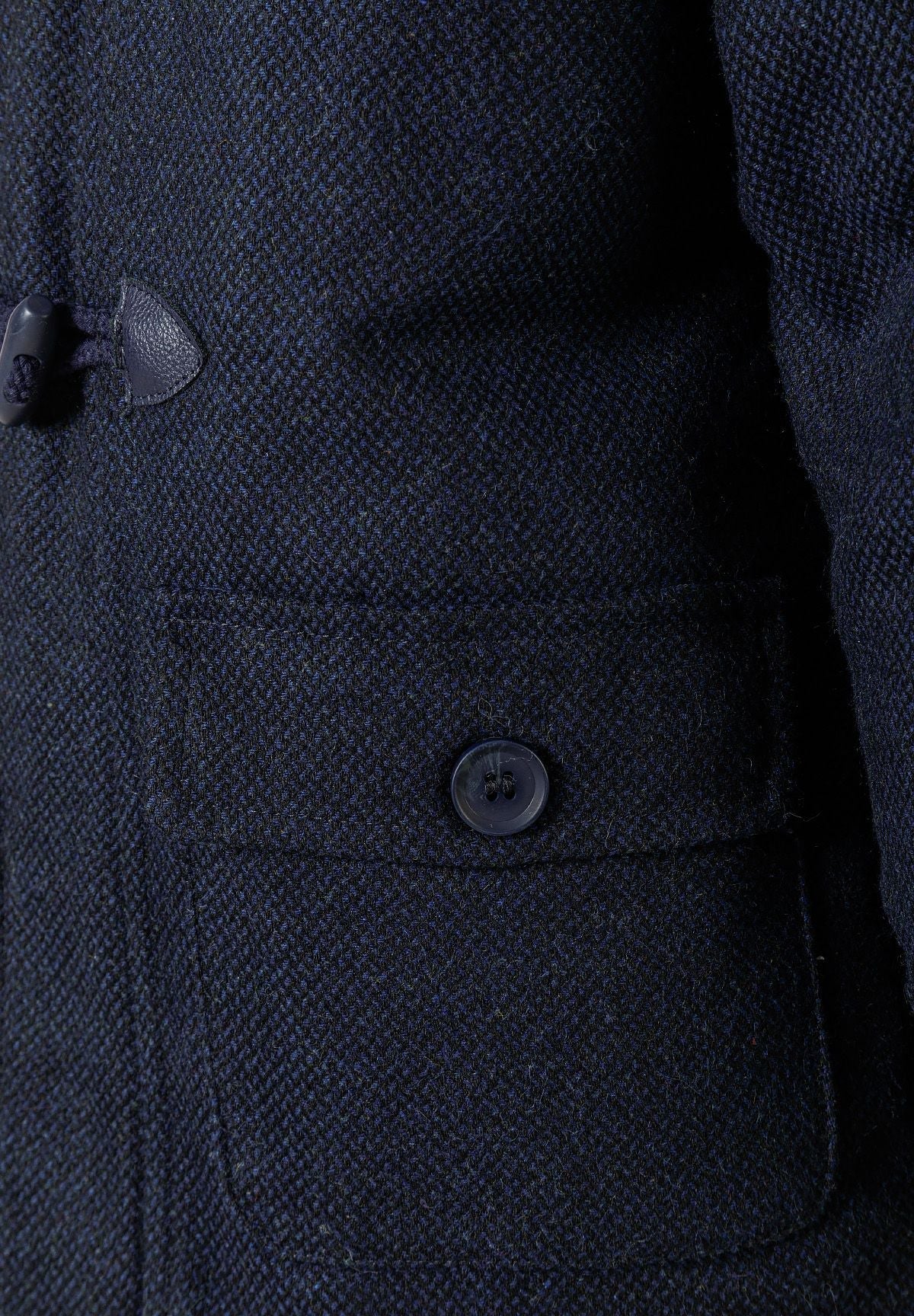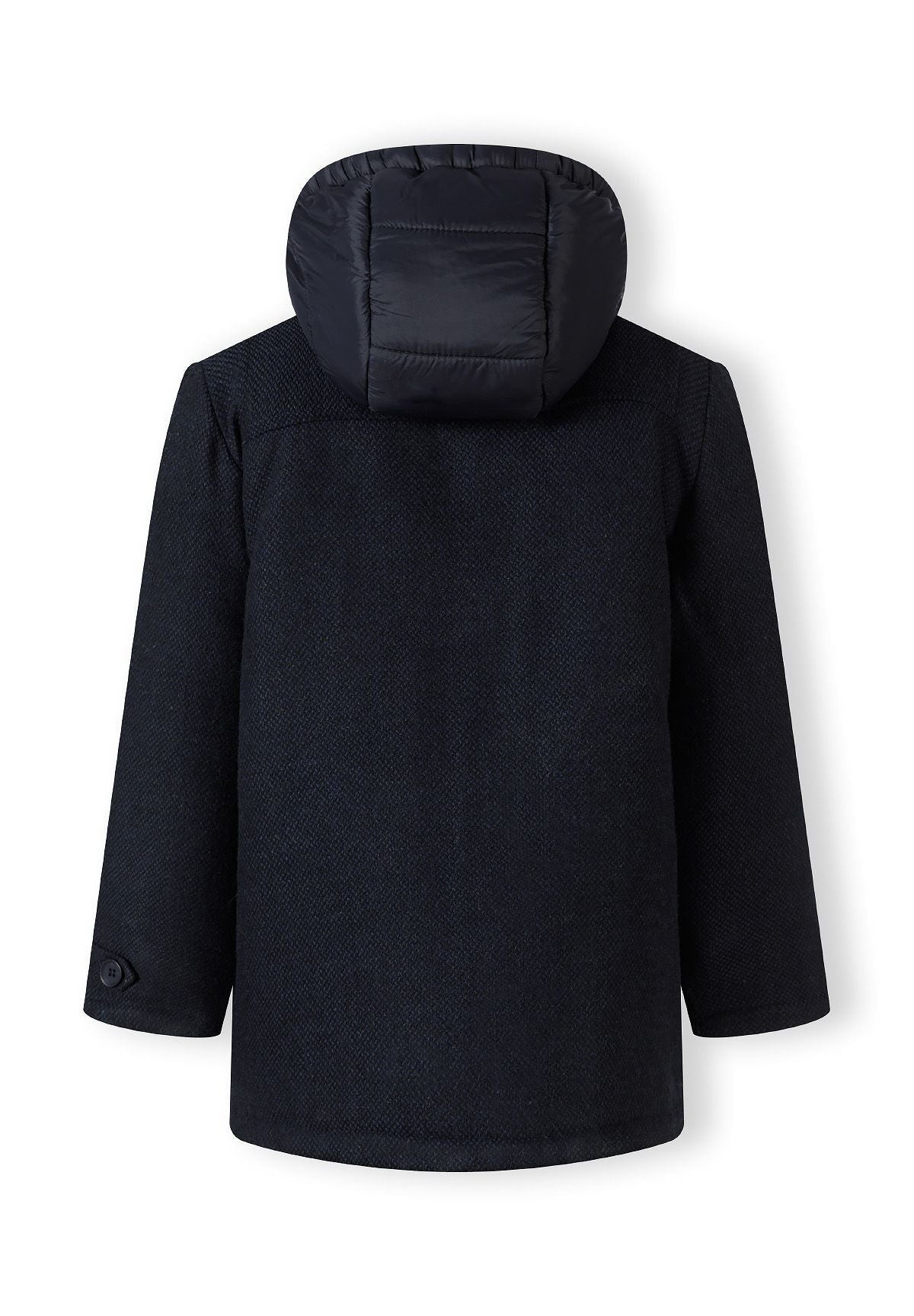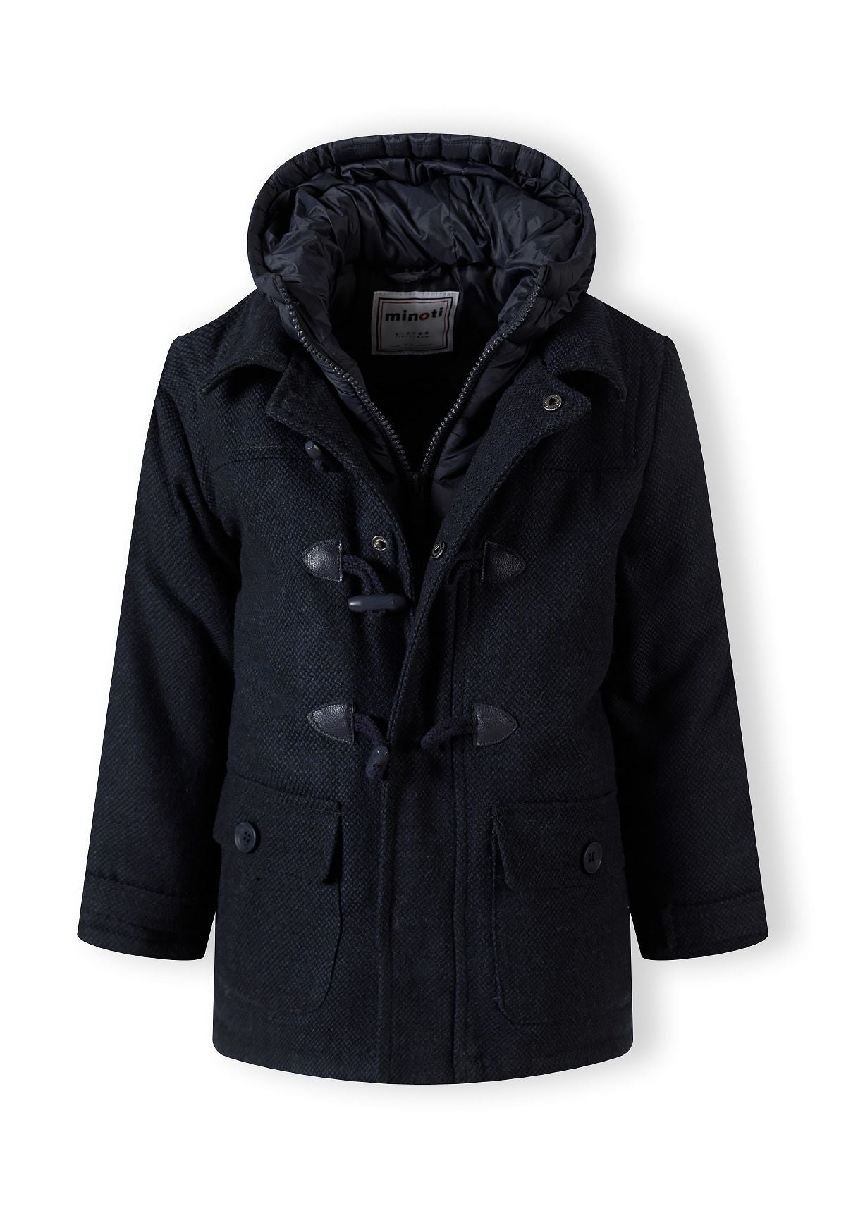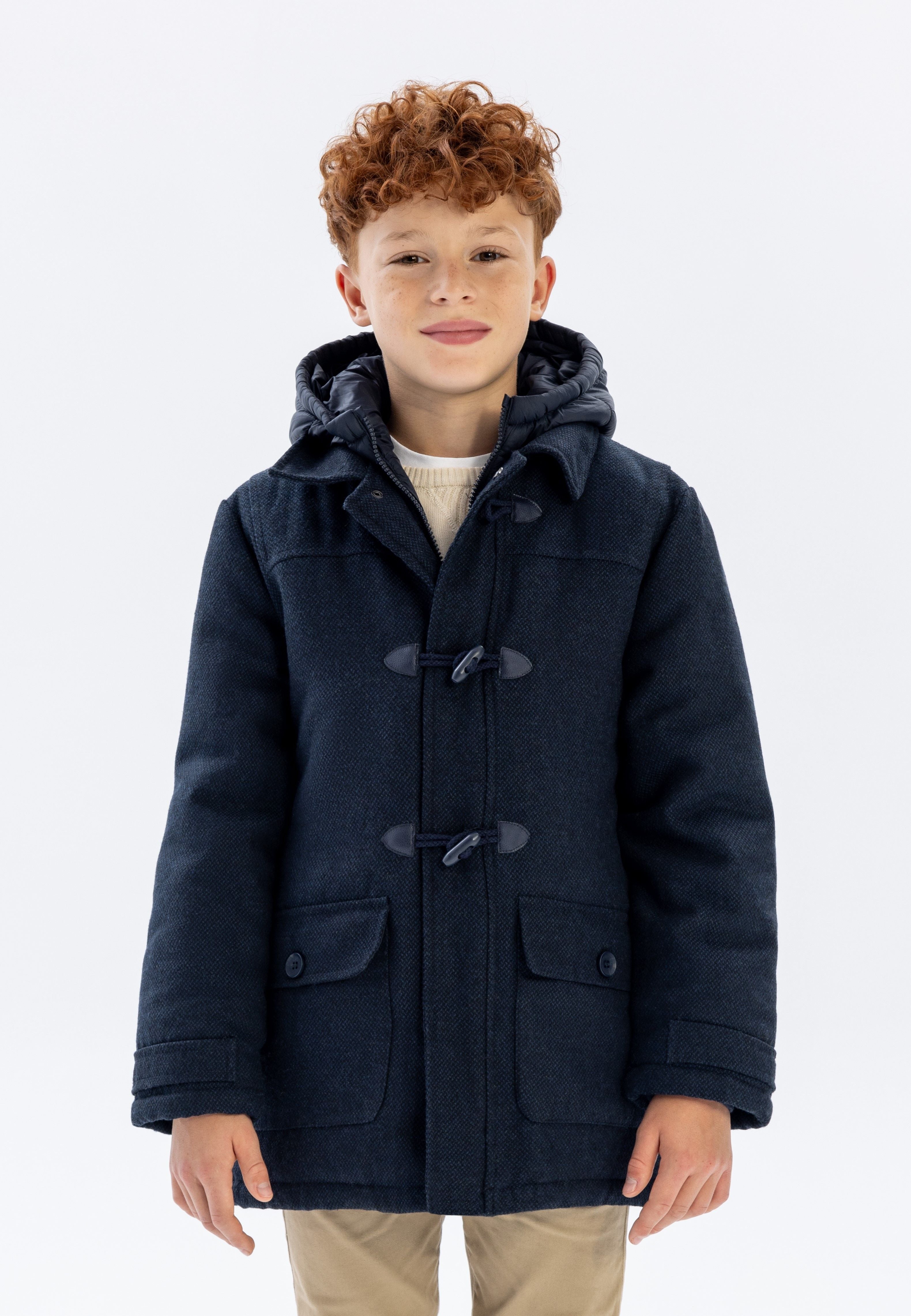 Płaszcz typu duffle dla chłopców, odpowiedni na jesień i zimę, wykonany z klasycznego granatowego tweedu o tkanej fakturze i tradycyjnym wzorze. Zaprojektowany z myślą o chłopcach, łączy nylonowy kaptur dla dodatkowej ochrony przed pogodą z wewnętrzną podszewką, która poprawia izolację i komfort. Płaszcz zapinany jest z przodu na troczki, zachowując tradycyjny styl duffle coat. Ściągacze na mankietach zabezpieczają końce rękawów, pomagając zatrzymać ciepło, a naszywane kieszenie zapewniają praktyczne miejsce do przechowywania. Jego konstrukcja pozwala na swobodę ruchów, dzięki czemu jest odpowiedni na codzienne i outdoorowe aktywności w chłodne dni. Płaszcz łączy tradycyjną tkaninę z funkcjonalną konstrukcją odzieży wierzchniej, oferując wszechstronność na chłodniejsze sezony.