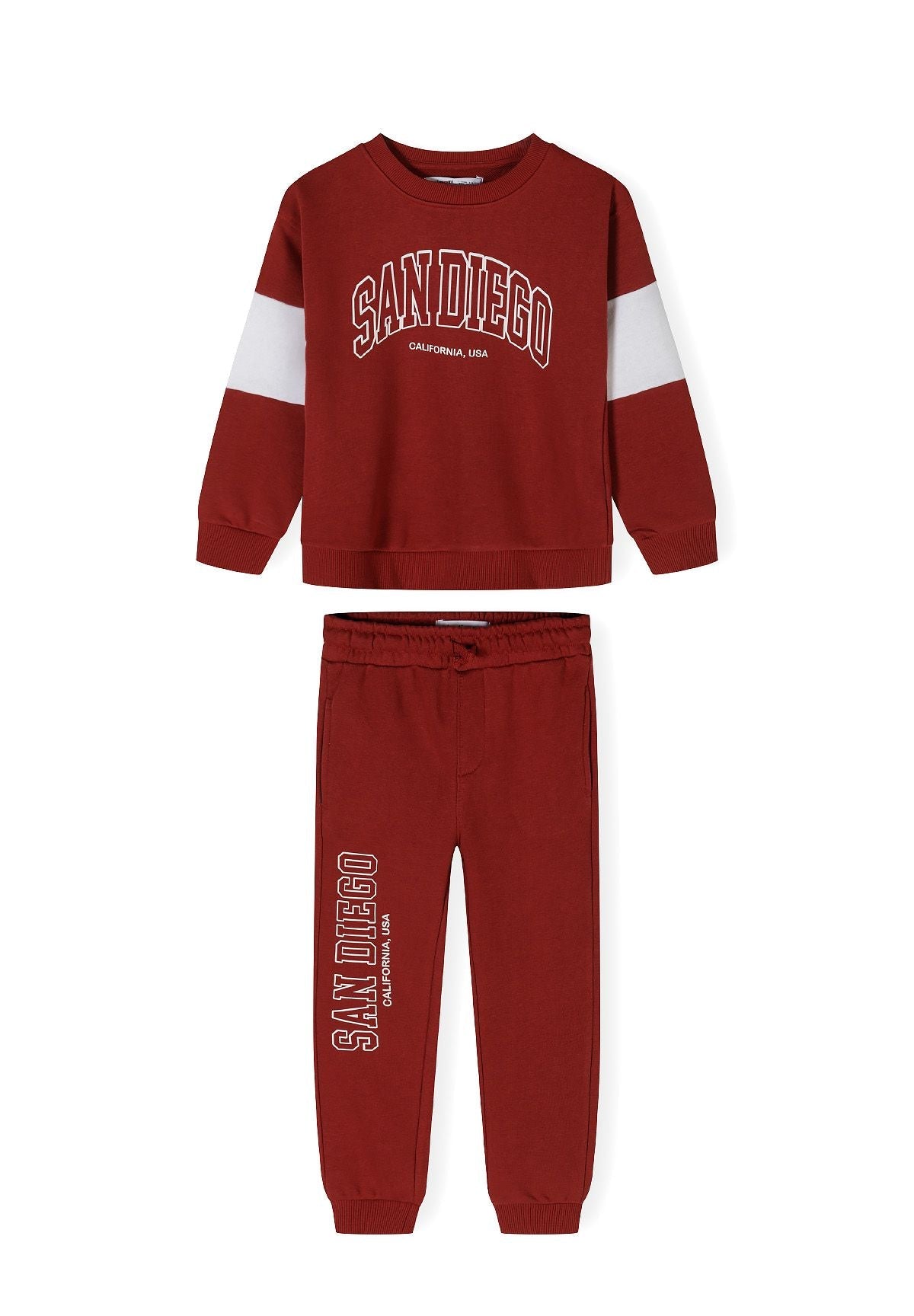 Zestaw ubrań dla chłopca składający się z bluzy z okrągłym dekoltem i dopasowanych spodni dresowych wykonanych z lekkiego bawełnianego polaru, który zapewnia komfort i przewiewność. Bluza ma okrągły dekolt wykończony prążkowanym ściągaczem, co nadaje jej schludny wygląd. Na przodzie znajduje się duży nadruk, uzupełniony kontrastowymi bocznymi panelami, które dodają subtelnych detali wizualnych. Rękawy i dół bluzy zakończone są elastycznymi ściągaczami, które zapewniają pewne dopasowanie bez ograniczania ruchów. Spodnie dresowe mają elastyczną talię z regulacją na sznurek dla indywidualnego dopasowania oraz praktyczne boczne kieszenie do przechowywania. Elastyczne ściągacze przy nogawkach pomagają utrzymać kształt i dopasowanie spodni podczas noszenia. Zestaw doskonale sprawdzi się zarówno na co dzień, jak i podczas aktywności, łącząc funkcjonalność z przemyślanym designem.
