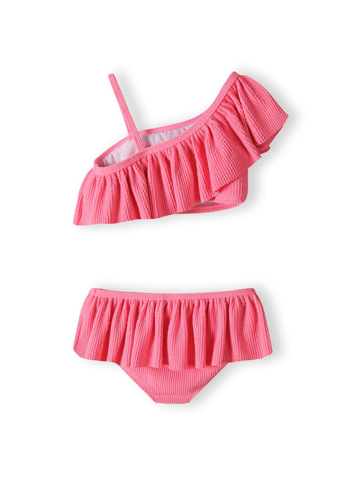 Dwuczęściowy strój kąpielowy dla dziewczynek w intensywnym różowym kolorze, odpowiedni zarówno na basen, jak i na plażę. Kostium składa się z topu bikini i dopasowanych majtek, zaprojektowanych tak, aby zapewnić wygodne i pewne dopasowanie oraz swobodę ruchów podczas aktywności wodnych. Materiał jest szybkoschnący, co sprzyja szybszemu odparowywaniu wody i zwiększa komfort po pływaniu. Wykonany z lekkiej tkaniny, kostium jest trwały i odporny na częste użytkowanie w środowisku wodnym. Gładka powierzchnia tkaniny ułatwia pranie i pielęgnację, zachowując kształt i kolor stroju na dłużej. Zaprojektowany z myślą o rekreacyjnym pływaniu i aktywnościach wodnych na świeżym powietrzu, strój kąpielowy zapewnia praktyczną funkcjonalność przez całe lato.
