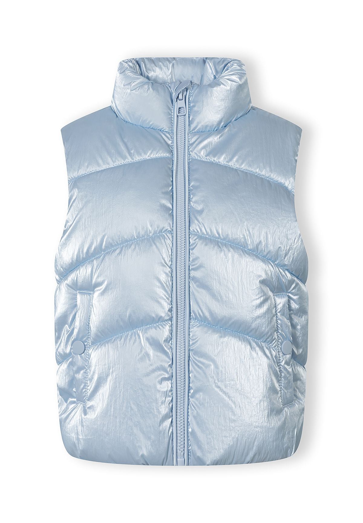 Dziewczęca pikowana kamizelka w metalicznym jasnoniebieskim kolorze prezentuje elegancki, dopasowany krój, idealny na przejściowe pory roku. Wykonana z wytrzymałego nylonu z podszewką i wypełnieniem z poliestru, zapewnia lekką izolację przy zachowaniu oddychalności dla komfortu.