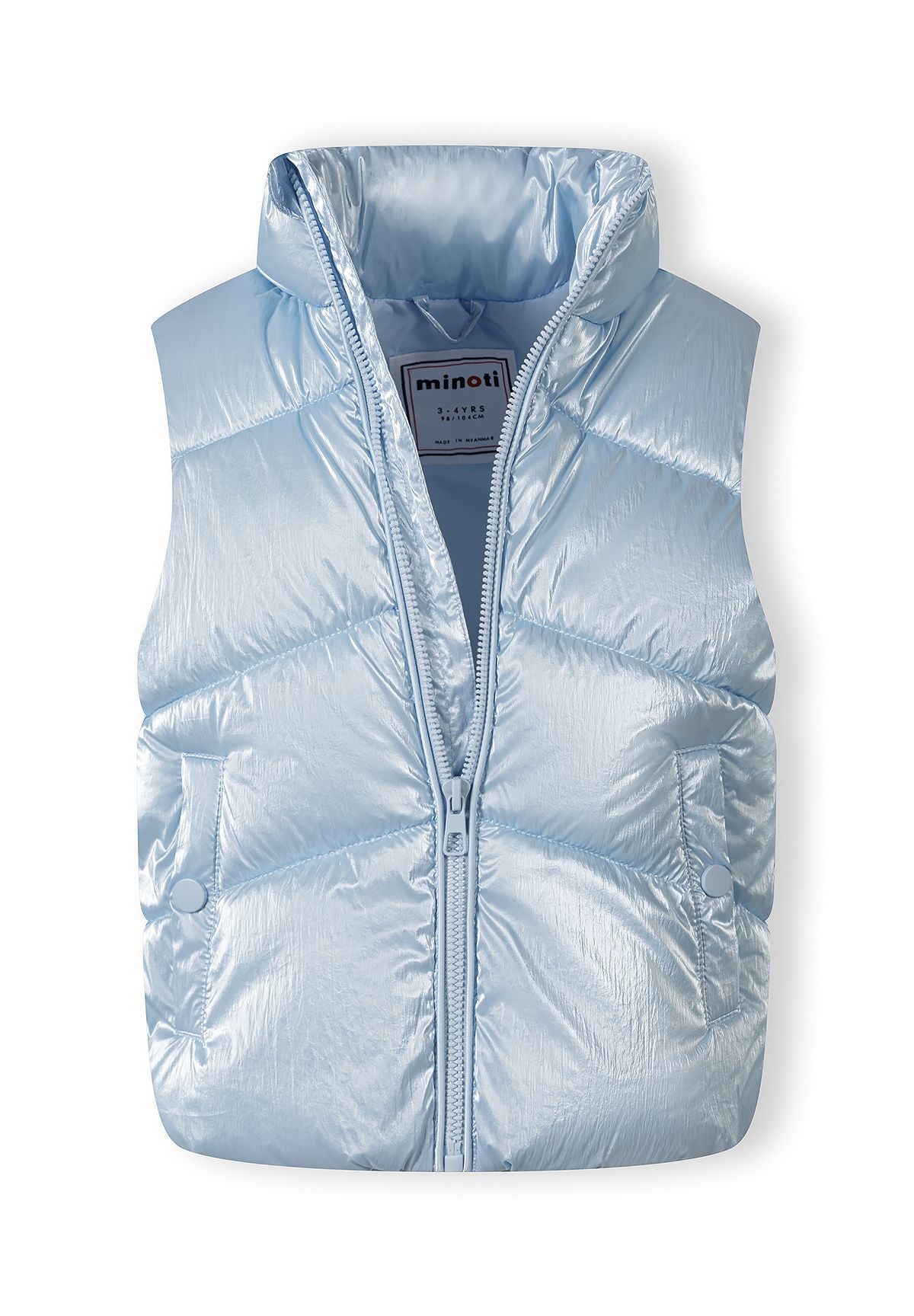 Dziewczęca pikowana kamizelka metaliczna jasnoniebieska z kołnierzem stójką, zamkiem błyskawicznym i bocznymi kieszeniami 9 miesięcy-7 lat