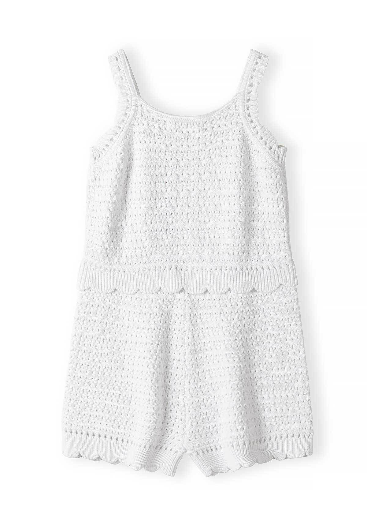 Biały dzianinowy kombinezon dla dziewczynek wykonany jest z dekoracyjnej dzianiny pointelle z przewagą bawełny. Zaprojektowany z szerokimi ramiączkami i usztywnionym dekoltem, zapewnia pewne i wygodne dopasowanie. Talia wykończona jest ozdobną taśmą bez gumki, co tworzy czystą i jednolitą sylwetkę.