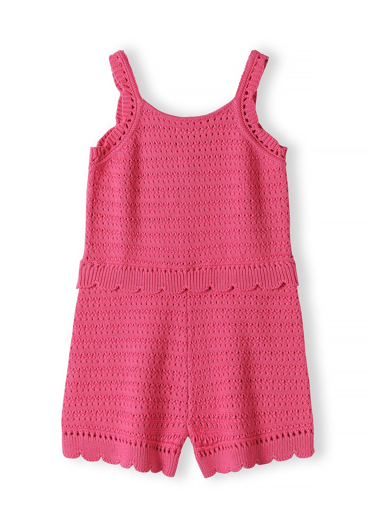 Dziewczęcy kombinezon na szydełku różowy z regulowanymi ramiączkami i falbankowymi brzegami 3-15 lat