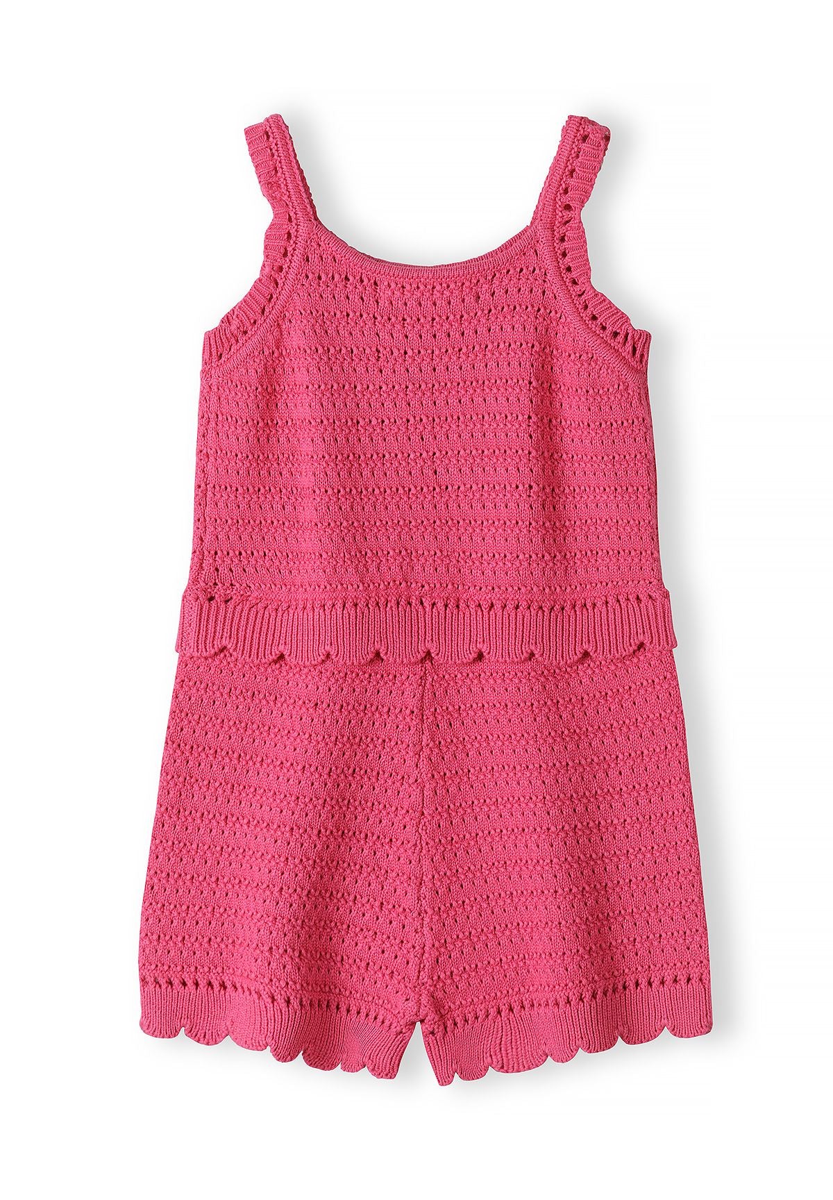 Przedstawiamy kombinezon dziewczęcy Minoti Crochet — piękny i przewiewny niezbędnik na ciepłe dni, łączący delikatne rzemiosło szydełkowe z praktycznym, codziennym komfortem. W klasycznym różowym kolorze z misternym wzorem szydełkowym i falistymi brzegami, ten kombinezon to idealny wybór na wiosenne i letnie dni, gdy liczy się styl i swoboda ruchów.