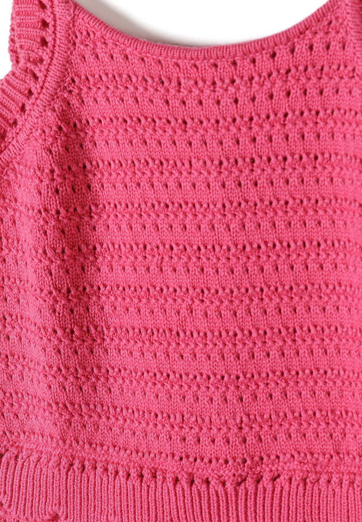 Bez rękawów, bez kołnierzyka, z regulowanymi ramiączkami dla idealnego dopasowania, dekolt w kształcie litery U, misterny wzór szydełkowy z falistymi brzegami oraz krótka nogawka zapewniająca swobodę ruchów — bezwysiłkowy styl na ciepłe dni w klasycznym różu.