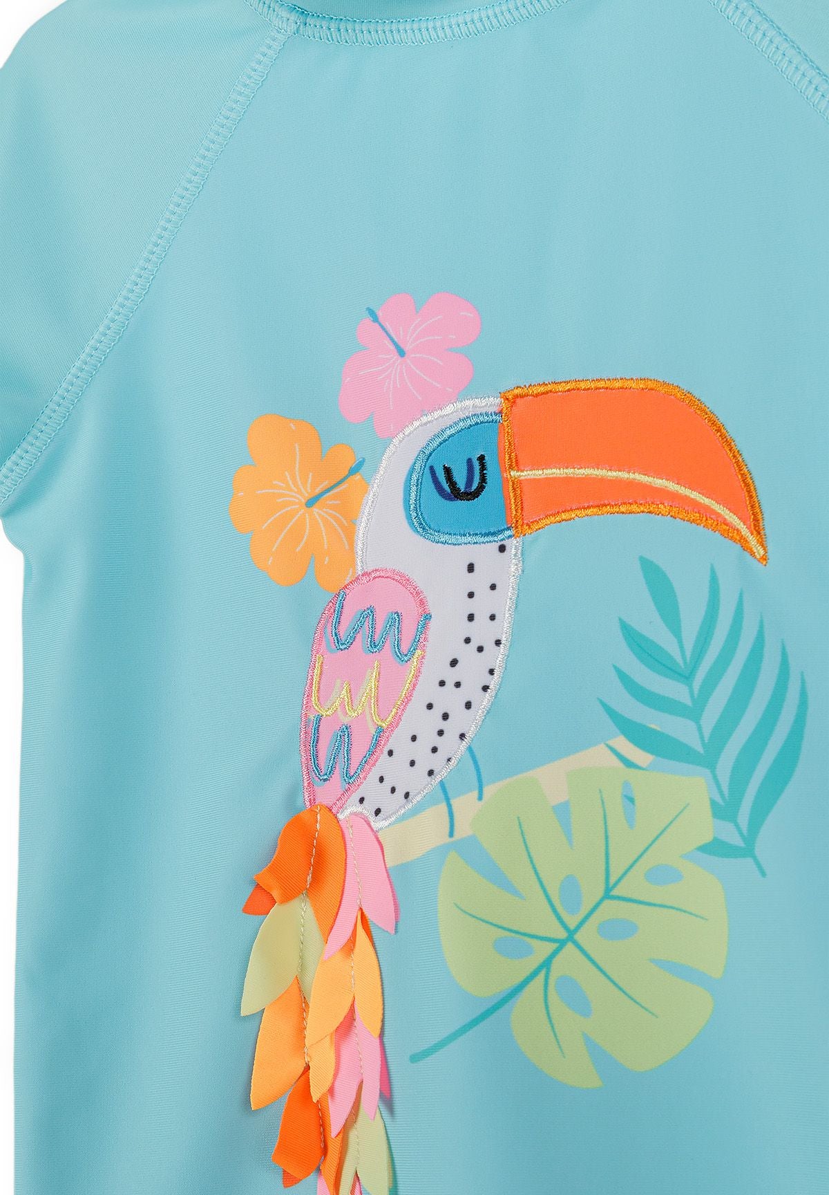 Ten dwuczęściowy strój kąpielowy dla dziewczynek wyróżnia się zabawnym turkusowym kolorem oraz charakterystycznym nadrukiem z tukaniem. Idealny dla młodych dziewczynek w wieku od 3 miesięcy do 7 lat, ten kompletny zestaw zawiera top bikini zapinany na zamek, dopasowane majtki oraz wyściełany kapelusz przeciwsłoneczny zapewniający niezbędną ochronę przed słońcem.