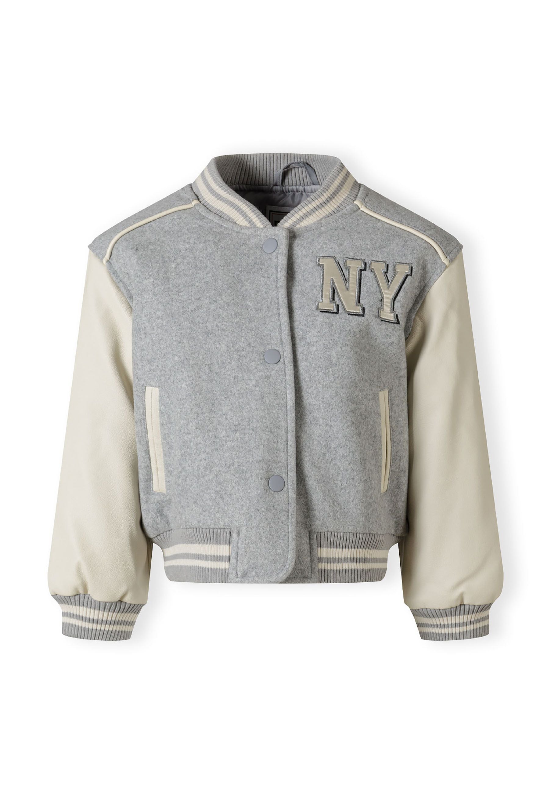 Dziewczęca kurtka w stylu baseballowym z rękawami z ekoskóry szara 2-14 lat