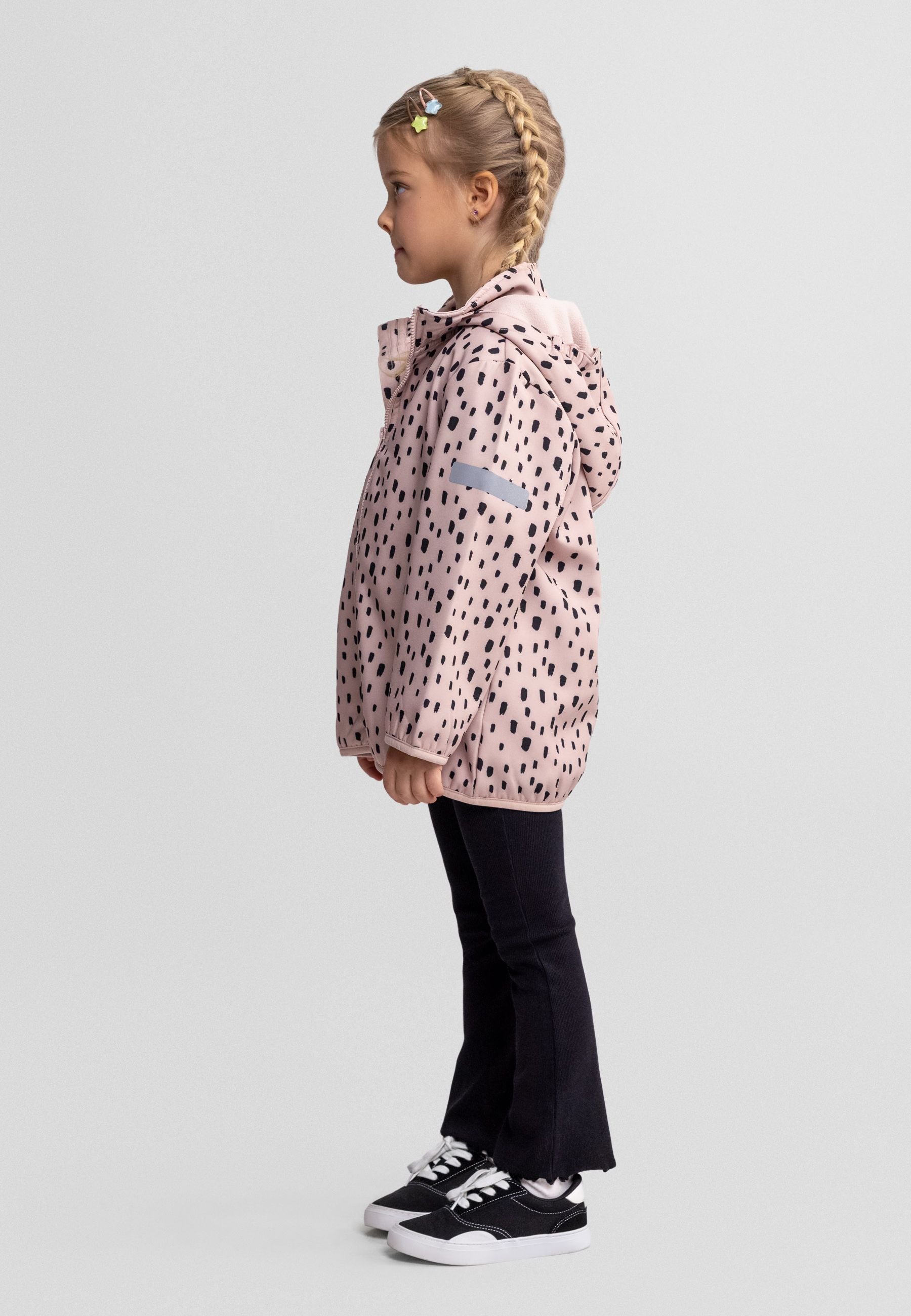 Ta dziewczęca kurtka softshell w delikatnym różowym odcieniu łączy wiatroszczelny poliester z elastanem na zewnątrz z ocieplającą warstwą polaru od środka dla dodatkowego ciepła. Posiada zamek błyskawiczny na całej długości oraz odpinany kaptur, co pozwala na dostosowanie do warunków. Zaprojektowana z regularnym krojem i długimi rękawami, kurtka oferuje praktyczne przednie kieszenie oraz ściągacze na mankietach zapewniające pewne dopasowanie. Jej trwała konstrukcja zachowuje kształt i kolor po praniu, co czyni ją niezawodnym wyborem na chłodniejsze dni i aktywne użytkowanie.