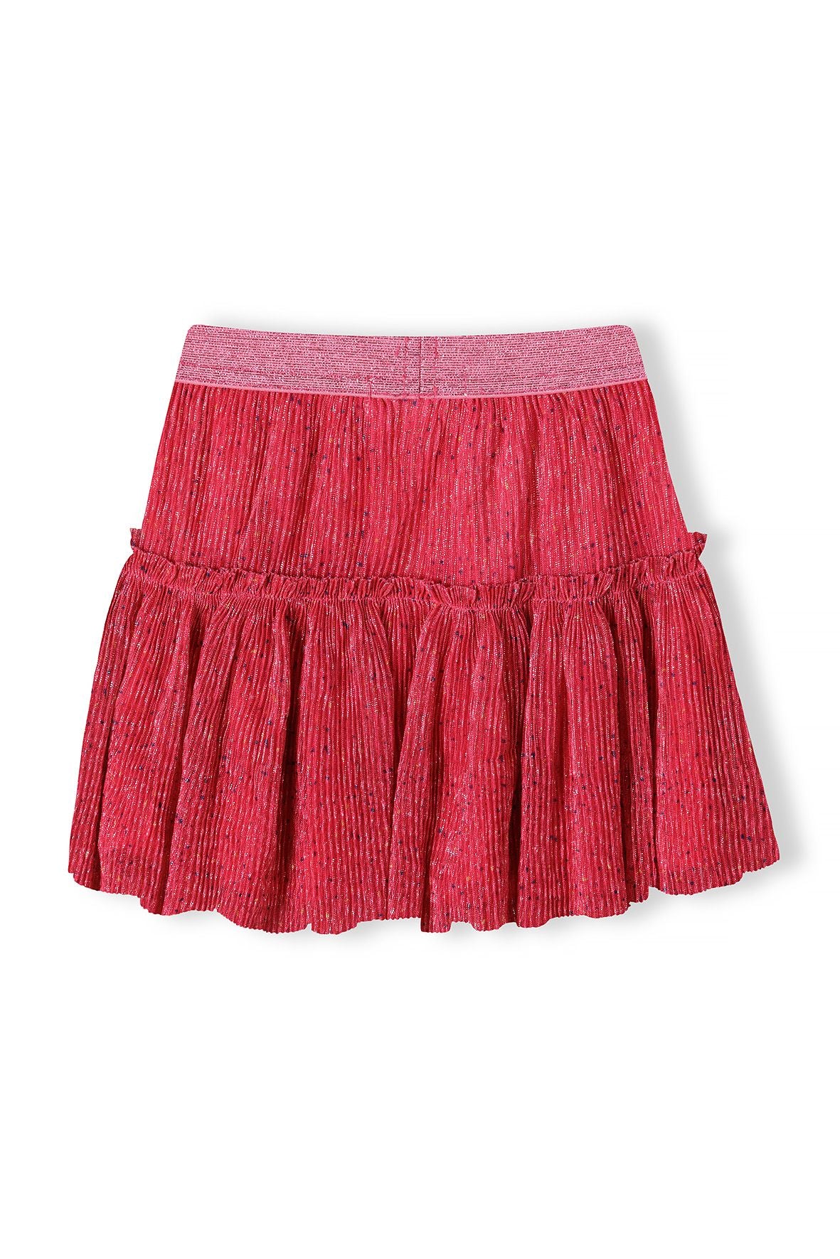 Spódnica zaprojektowana dla dziewczynek, przeznaczona na przyjęcia, ozdobiona różowym, błyszczącym nadrukiem na całej powierzchni. Ubranie posiada płaski, elastyczny pas pokryty brokatem, zapewniający pewne i wygodne dopasowanie. Jej warstwowa, plisowana konstrukcja z marszczonymi fragmentami zwiększa objętość i tworzy żywą sylwetkę. Spódnica jest zakładana przez głowę, co ułatwia ubieranie. Wykonana z lekkiego materiału, pozwala na swobodę ruchów, zachowując jednocześnie błyszczące wykończenie przez cały czas noszenia. Plisowana spódnica nie zawiera dodatkowych elementów konstrukcyjnych, takich jak kieszenie czy mankiety, i została zaprojektowana tak, aby łączyć ozdobne cechy z praktyczną wygodą.