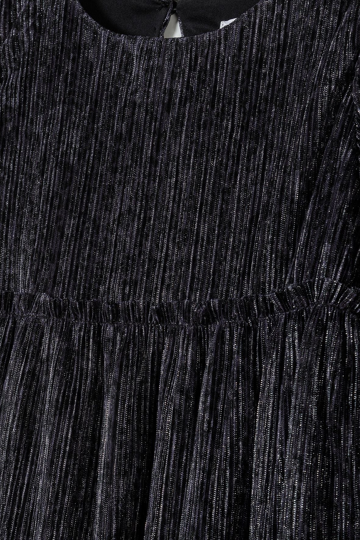 Sukienka na przyjęcie dla dziewczynek, charakteryzująca się czarną bazą ozdobioną nadrukiem z błyszczącymi elementami, idealna na świąteczne i wyjątkowe okazje. Sukienka ma długie rękawy w stylu balonowym z elastycznymi mankietami, które zapewniają ciepło i wygodne dopasowanie. Posiada marszczoną, podwójną spódnicę z falbanami ułożonymi w stopnie, tworząc plisowaną, pełną objętości sylwetkę, która dodaje elegancji całemu projektowi. Ukryty zamek błyskawiczny z tyłu ułatwia zakładanie i zdejmowanie. Konstrukcja łączy dekoracyjny blask z praktycznym podejściem do komfortu ruchu, dzięki czemu sukienka nadaje się na uroczystości lub formalne spotkania, gdzie liczy się zarówno styl, jak i funkcjonalność.
