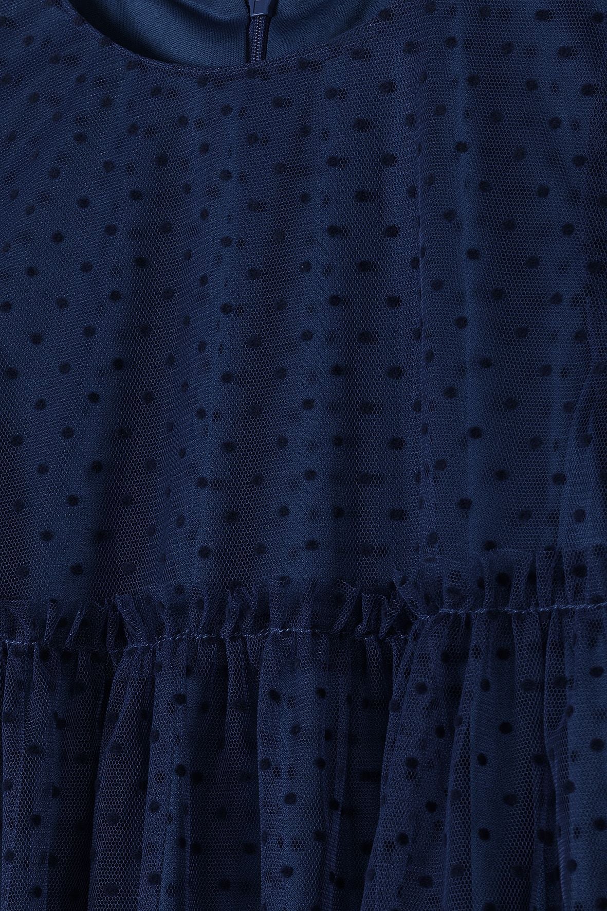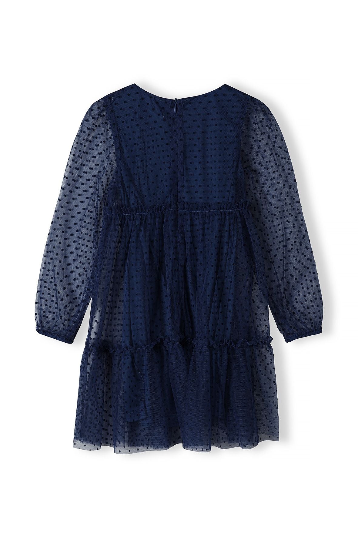 Sukienka na przyjęcie dla dziewczynek wykonana z granatowej siateczkowej tkaniny z nadrukiem typu flock na całej powierzchni, zaprojektowana specjalnie na uroczyste okazje. Sukienka ma długie bufiaste rękawy, które zapewniają dodatkowe ciepło i kończą się elastycznymi mankietami, gwarantującymi wygodne i pewne dopasowanie. Gorset płynnie przechodzi w marszczoną, podwójną falbanę z warstw, tworząc dodatkową objętość i zabawną sylwetkę. Siateczkowa tkanina ma delikatną fakturę, która podkreśla wizualny efekt, jednocześnie zapewniając przewiewność. Elastyczne mankiety pomagają utrzymać rękawy na miejscu podczas noszenia, łącząc funkcjonalność z designem. Sukienka skutecznie łączy styl z praktycznością, zapewniając swobodę ruchów i odpowiedniość na uroczystości lub specjalne wydarzenia.