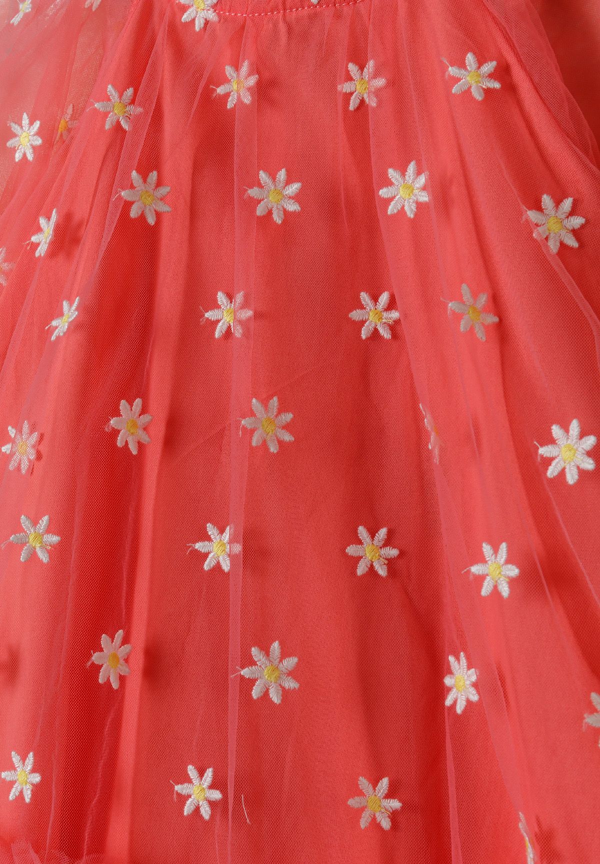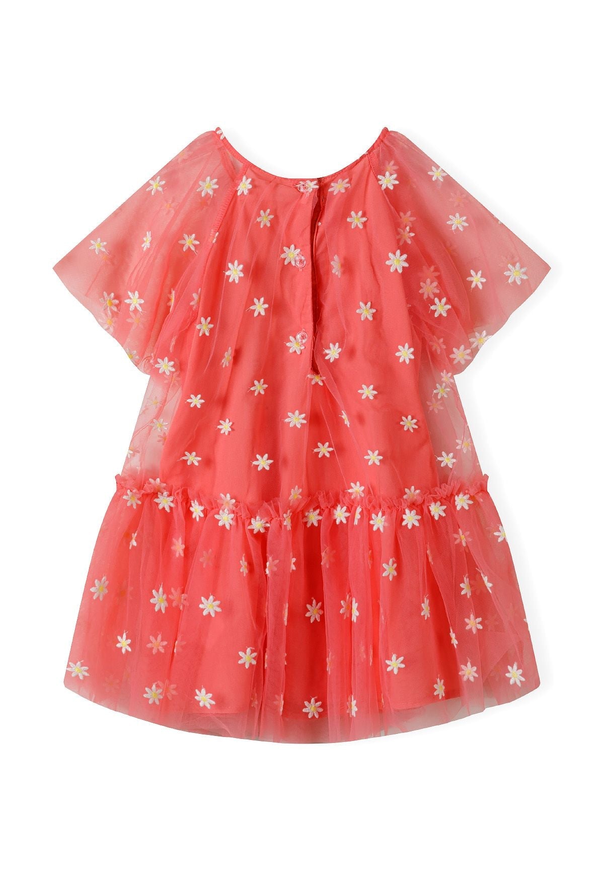 Sukienka na przyjęcie dla dziewczynek wykonana z warstwowej, koralowej siateczki, która zapewnia miękki i lekki wygląd, idealny na ciepłe dni. Zaprojektowana z myślą o dziewczynkach, sukienka posiada misterną kwiatową haftowaną dekorację na dopasowanym gorsecie, dodającą szczegółowej faktury i atrakcyjnego wyglądu. Bezrękawowy krój gwarantuje swobodę ruchów i komfort noszenia. Strukturalny gorset przechodzi w spódnicę w kształcie litery A, wykonaną z delikatnie ułożonych warstw siateczki, tworząc subtelną objętość i elegancki kształt. Okrągły dekolt zachowuje klasyczną i elegancką sylwetkę, odpowiednią na specjalne okazje. Sukienka łączy styl z praktycznością, zaprojektowana tak, aby zapewnić dzieciom wygodę oraz przewiewność, idealną na sezonowe, świąteczne wydarzenia.