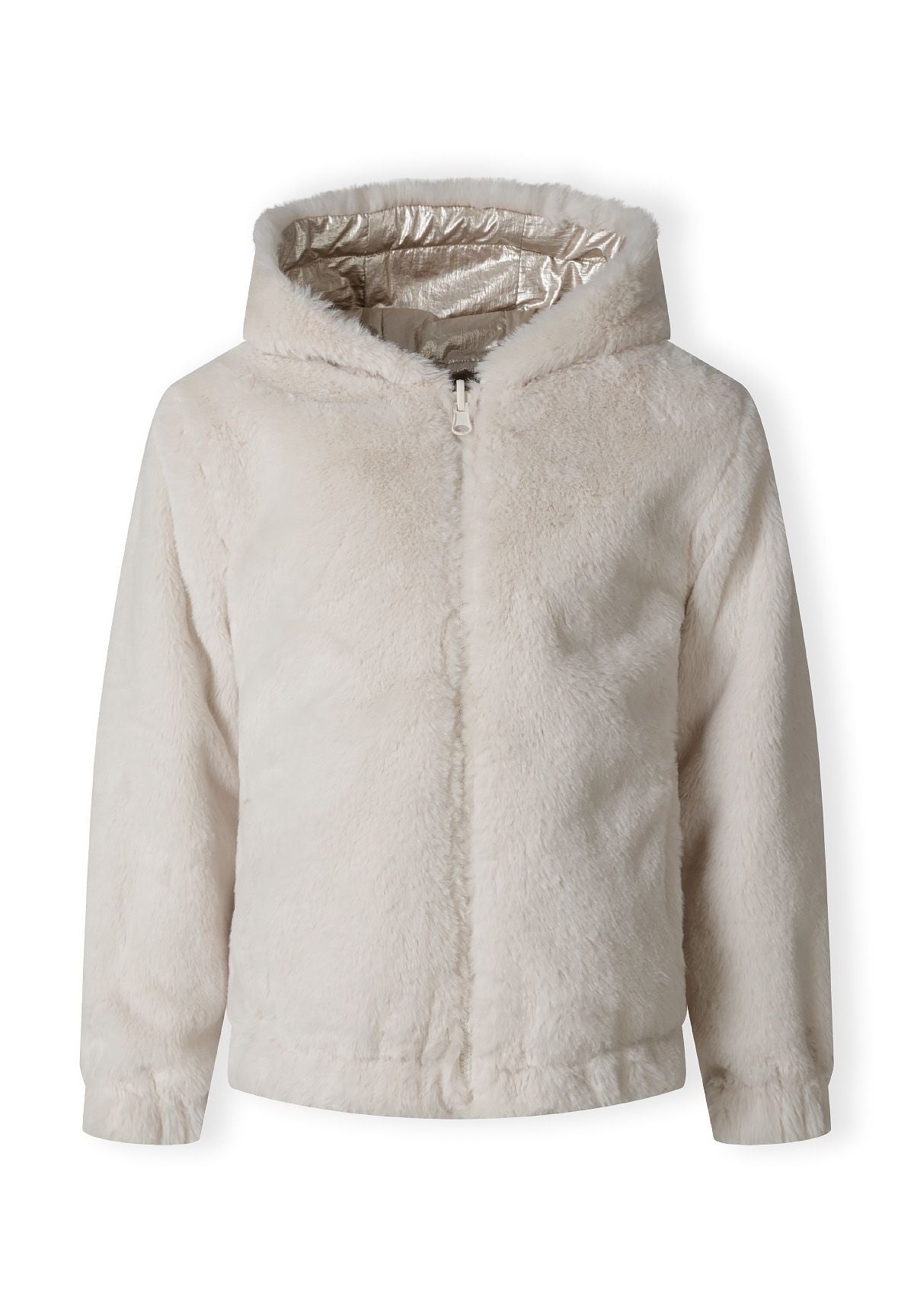 Rodzice uwielbiają tę kurtkę, ponieważ jest naprawdę sprytna — dwa zupełnie różne wyglądy w jednym ubraniu. Metaliczna strona jest idealna na dni, gdy dziewczynki chcą się wyróżnić, strona z futerkiem teddy jest nieodparcie przytulna na chłodniejsze dni, a beżowy kolor sprawia, że obie strony łatwo łączyć z innymi ubraniami. To kurtka, którą nosi się codziennie, bo zawsze jest powód, by ją odwrócić.
