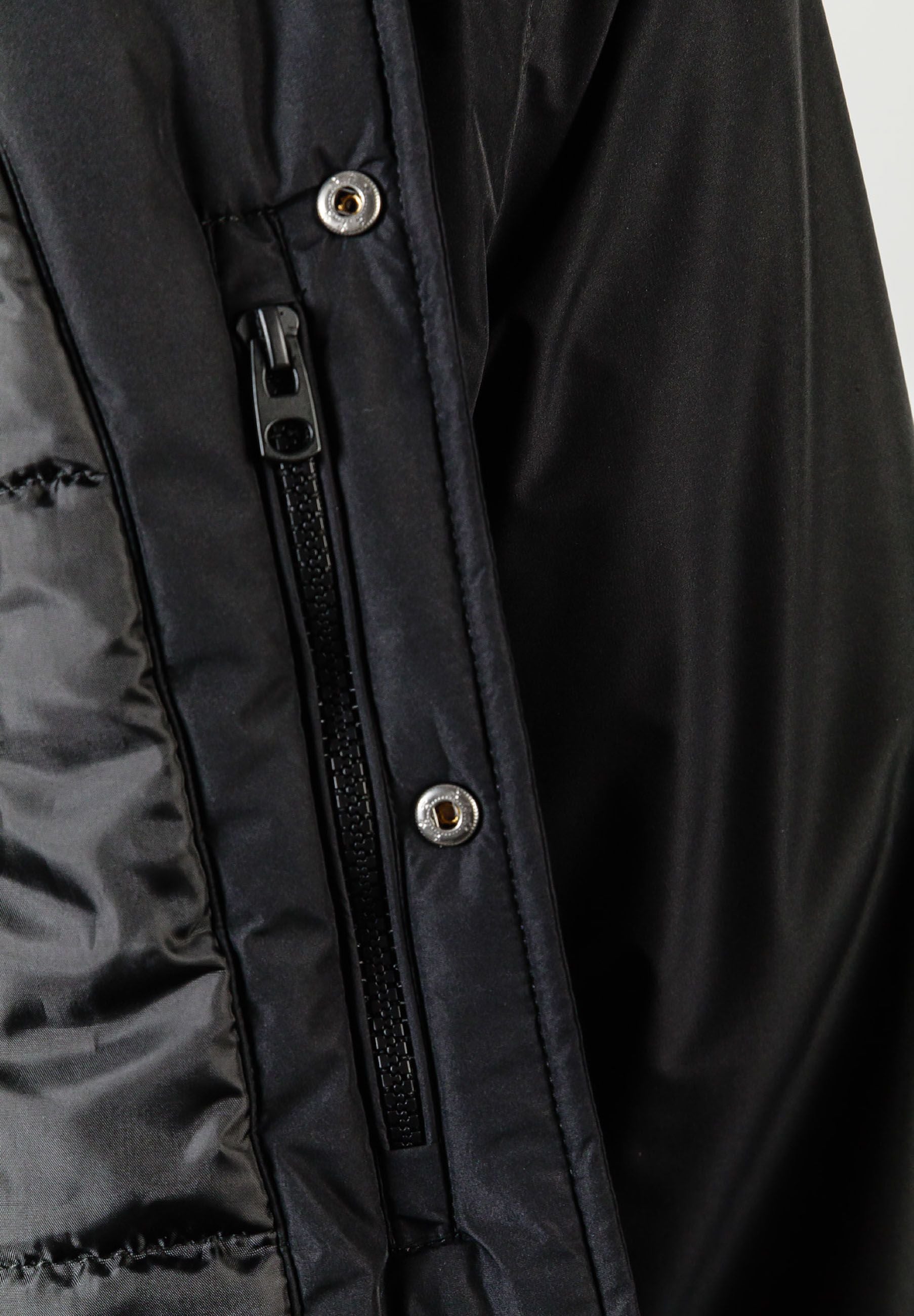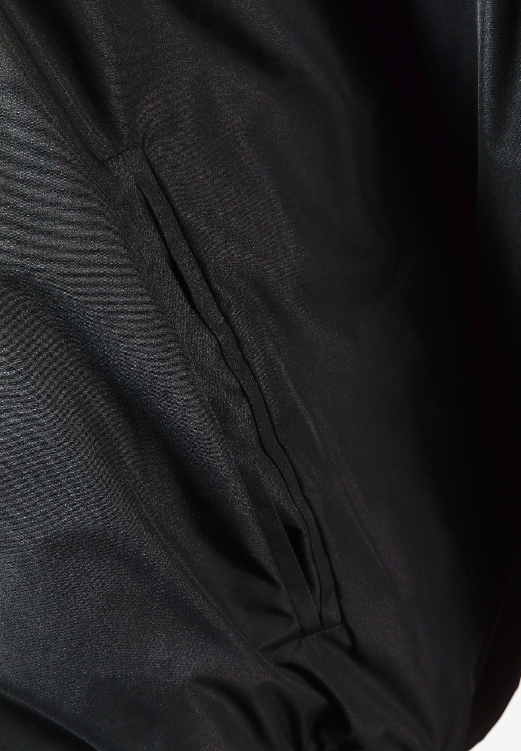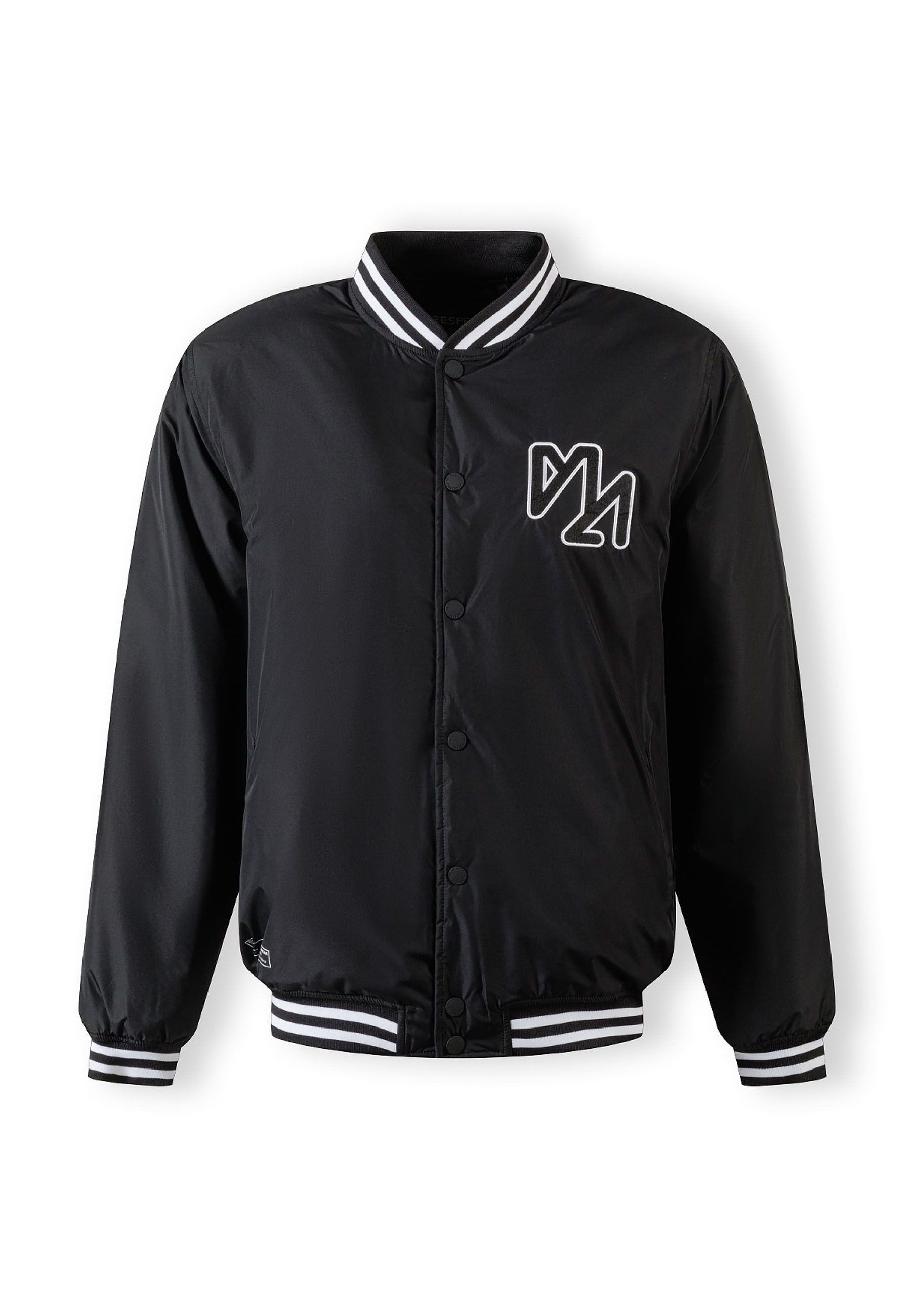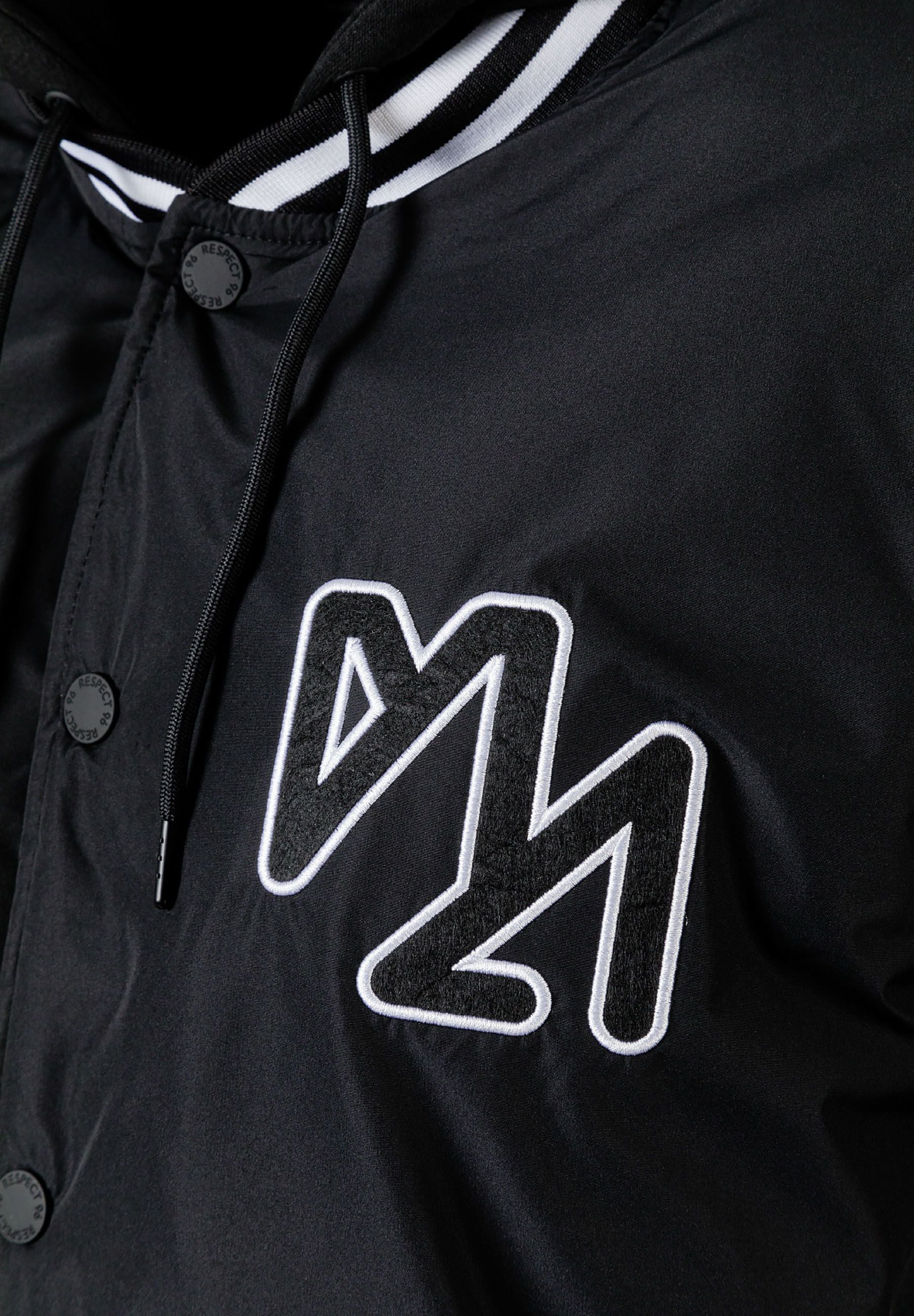 Męska kurtka w stylu baseballowym, zaprojektowana na pogodę przejściową, oferująca elastyczne możliwości warstwowania. Kurtka jest dostępna w czarnym kolorze z klasycznymi cechami varsity, takimi jak ściągacze na mankietach, pasie i podszyciu kaptura, każdy podkreślony kontrastowymi paskami. Posiada odpinany kaptur wykonany z dzianiny dresowej, zapinany na guziki i wyposażony w regulowany sznurek dla indywidualnego dopasowania. Na piersi znajduje się haftowane zdobienie dla subtelnej dekoracji. Odzież wyposażona jest w połączenie zamka błyskawicznego i zatrzasków na kieszeniach, co zwiększa praktyczność użytkowania. Konstrukcja odzwierciedla tradycyjną estetykę kurtki baseballowej połączoną z funkcjonalnymi elementami odzieży wierzchniej, odpowiednimi na zmienne warunki sezonowe i warstwowanie.